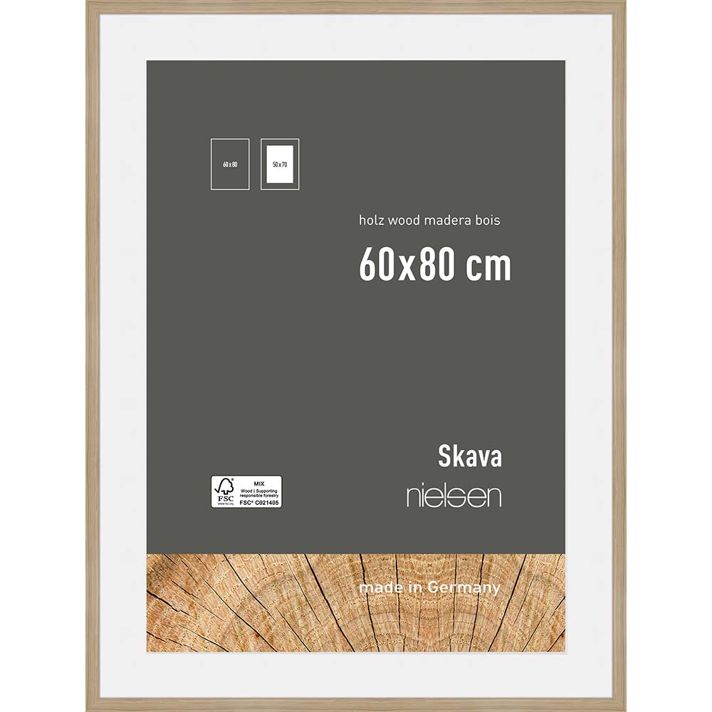 Avec ses moulures en bois de pin certifié FSC®, le cadre Skava affiche un style chaleureux et d’inspiration scandinave. Son passe-partout blanc intégré de 1,4 mm d’épaisseur vous permet non seulement de cadrer votre sujet et de cacher ses bords (pour un effet exposition réussi !) mais également d’utiliser ce cadre dans deux formats différents.